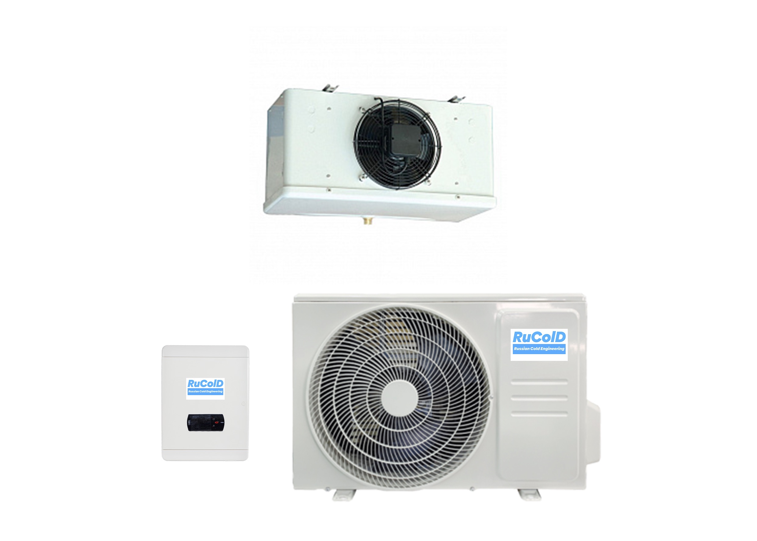 Холодильные сплит-системы RuColD состоят из трех частей: внутренний блок(испаритель), наружный блок(компрессорно-конденсаторный блок) и выносной пульт управления(на базе интеллектуального контроллера).